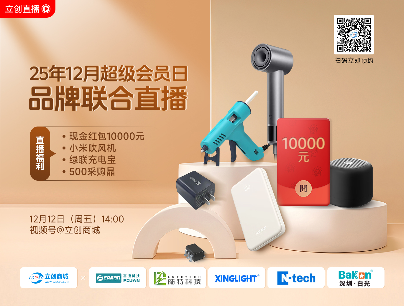 直播全程会不定时派送万元现金红包、米家高速吹风机、便携充电宝、蓝牙音响等多重好礼,现在前往立创商城公众号、视频号预约直播,锁定福利,不错过任何惊喜!